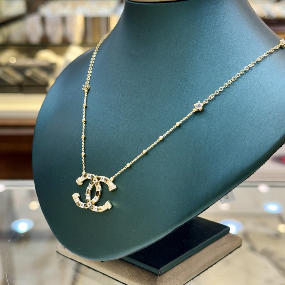عقد بتصميم شانيل مزين بكريستلات زركون نقي منشره في اماكن متفرقه من السلسال.