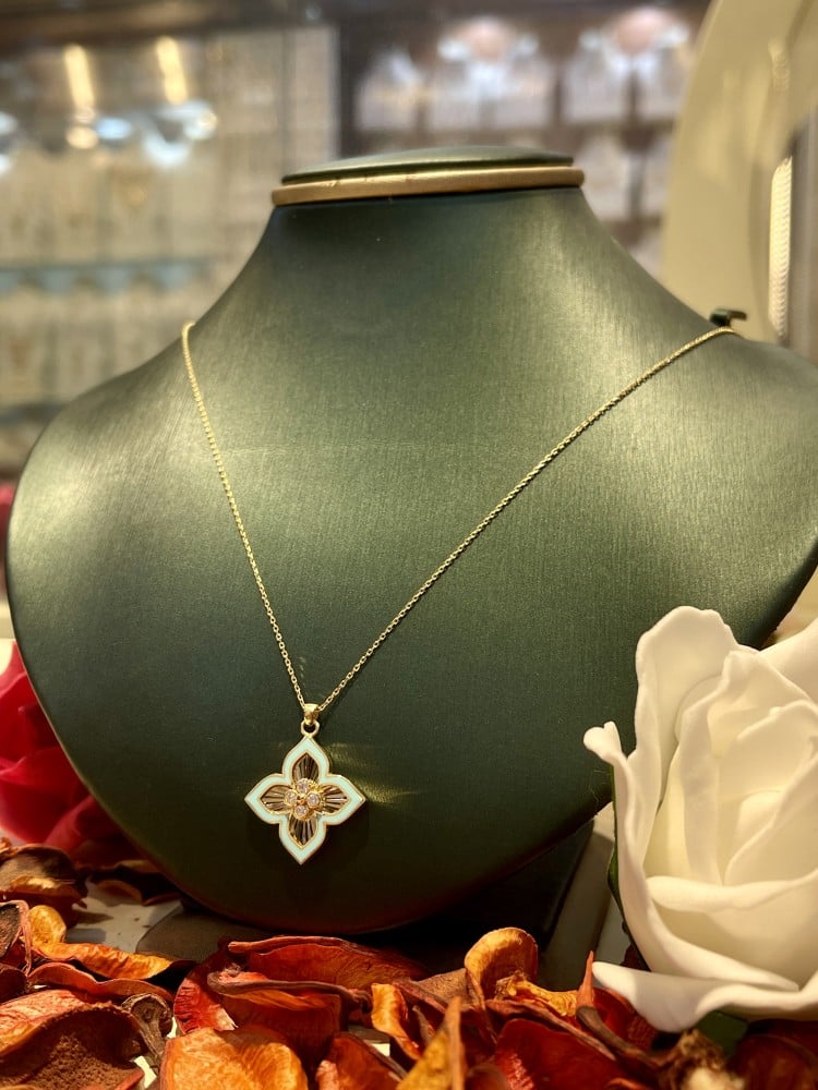 عقد ذهب ورده زرقاء بتصميم روبيرتو كوين عيار 18 صناعه ايطاليه متوفر الان في متجر جوهرتي للمجوهرات. عقد الذهب بنعومه مظهره و الابداع التام في تصنيعه يجعلانه الهديه الامثل لمن تحب. وهو من افضل العقود للاستخدام الشخصي و اليومي. من المؤكد بانه سوف يزيد ثقتك بنفسك في الجمعات و المناسبات.